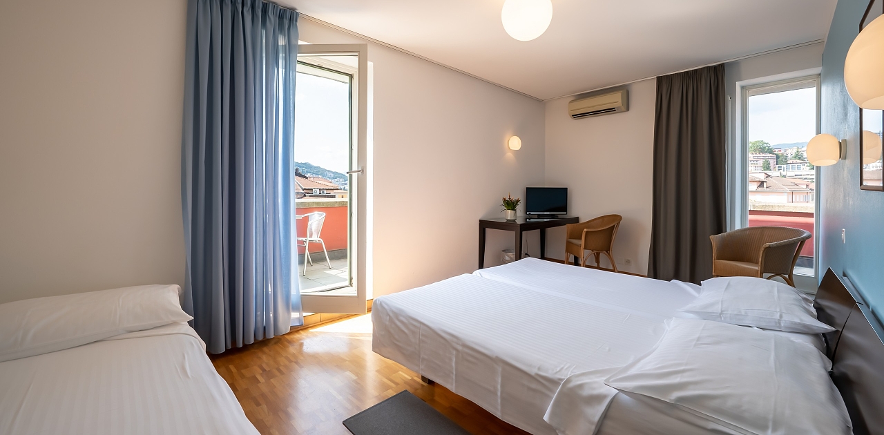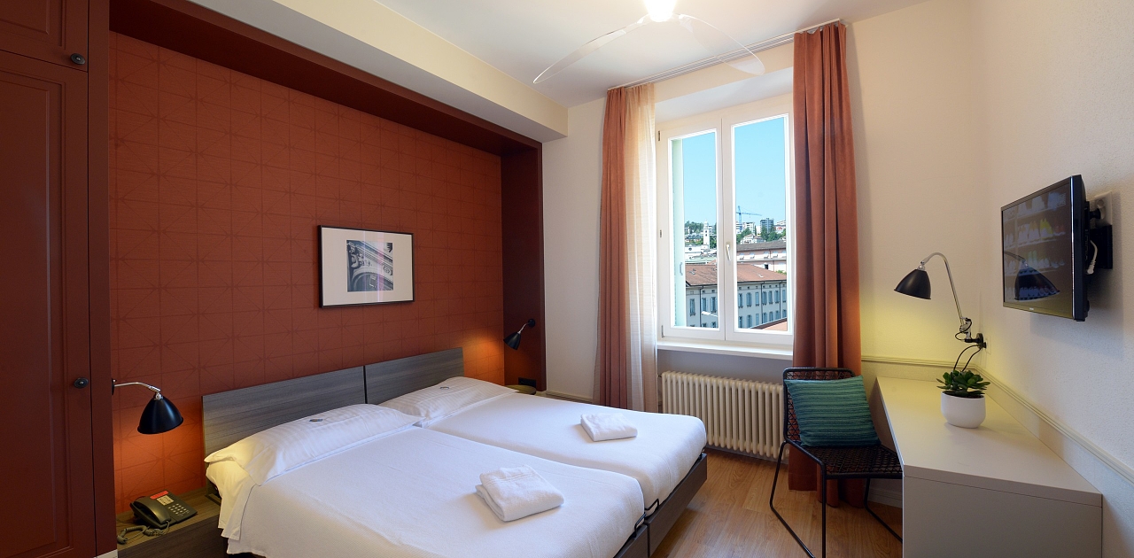 Single and double CLASSIC rooms with shower or bath, WC, TV, hairdryer, situated on the 4th floor, some with balcony and lake view, some with balcony and view over the roofs of Lugano, all with air condition - simply furnished with attention to detail